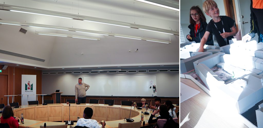Sedan sätter vi oss ner i sessionssalen där kommunstyrelsen brukar ha sina möten. Andreas visar oss olika förslag på hur kommunen vill förändra Möllevångsskolans skolgård. Vi är överens med honom om vilket alternativ som är bäst.