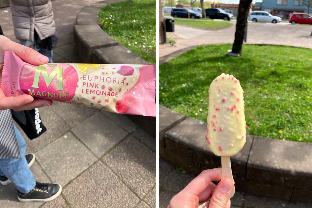 Euphoria Pink Lemonade är en ny Magnum-glass. På utsidan är det vit choklad och små krispiga hallonbitar som nästan påminner om godiset pop rocks. Inuti finns det gräddglass och en syrlig, rosa kärna som smakar bär. Den har en bra balans mellan syrligt och gräddigt.